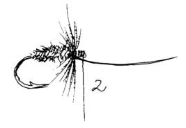 I turn the hackle, tie it down and wind the thread through the wound hackle and finish with a couple of half-hitches in front of the hackle. This last procedure can be something of a problem, when we as the custom is to-day have our thread on a bobbin-holder.