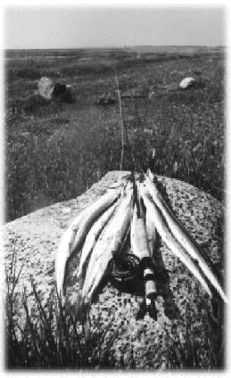 If you see fish, just cast to them and let your fly sink a bit. Then retrieve slowly, maybe in small jerks. The figure-of-eight retrieve comes in handy here. Contrary to what many people think, this fast moving fish isn't only stimulated by fast moving food items. The fish will go for the fly and often miss a couple of times. Have patience and strike lightly on any feeling of weight in the rod. Keep on retrieving even if you have felt or have missed a fish.