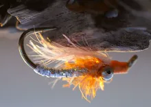 I wanted a bonefish-style fly, as bright as possible but a bit lighter than what I had in my bonefish flybox. The natural choice was to take every bright material I had and build a small Crazy Charlie type of fly. I also wanted some orange in the fly. We Danes are convinced that orange is good in the winter. Alas I dug out some orange flash chenille, a material I already use for one of many sea trout anglers' trusty winter companions, the Glitter Shrimp.