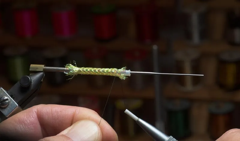 Start the thread in the front end of the mylar tube, right behind the end of the fly tube. You need very little space for the wing - no more than the size of the head