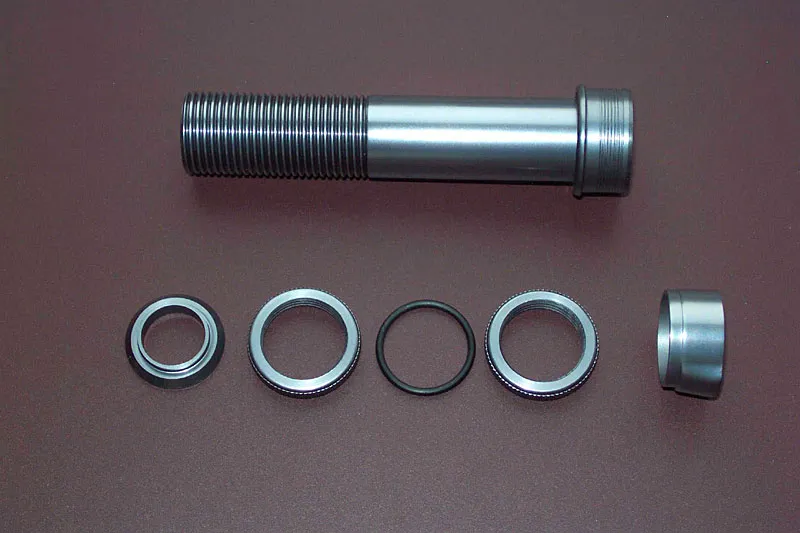 From left to right: transition shim, 1st lock nut, rubber o-ing, 2nd lock nut, guide foot hood.